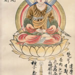 This is a copy of a leaf from the Album of Buddhist Deities of the Diamond and Womb Realms, a twelfth-century visual compendium based on the Diamond Peak Sūtra, a foundational scripture of Esoteric Buddhism. The album serves as a detailed guide to the complex iconography of the deities and their positions within the mandala. Unlike more common monochromatic iconographic drawings, this album was vividly colored, suggesting that it was produced under elite patronage. Originally containing more than one hundred leaves, the album was preserved at Ganjōji Temple in Kumamoto until around 1928, when it was dismantled and its leaves dispersed among various public and private collections.