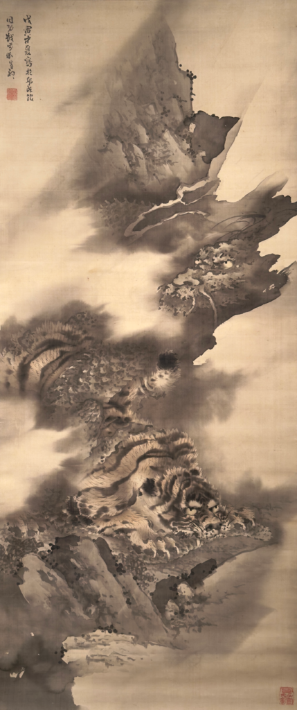 Signature: Boin chūka, Kotōkan [ni] oi[te] Dōkō, Echizen no Suke, Gan Ku sha[su] 戊寅中夏寫於乕頭館同功越前介岸駒 (In the mid-summer of boin cyclical year [Fifth month of 1818], at the Tiger Head Studio, Dōkō, Assistant Governor of Echizen Province, Gan Ku painted this.)