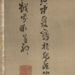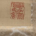 Verso of the box lid: Kono fuku senjin Tenkai-ō no sho ga/ Kenpon chokutei/ Meiji nijūshichi-nen kōgo natsu gogatsu/ Kishi Chikudō kan 此幅先人天開翁之所画/ 絹本直幀/ 明治廿七年甲午夏五月/岸竹堂觀 (This painting, was painted by my ancestor Tenkai-ō [Gan Ku], on silk, plain mounting. Fifth month of summer, Meiji 27, kōgo cyclical year [1894]. Viewed by Kishi Chikudō.)