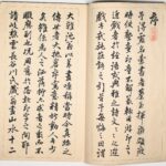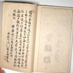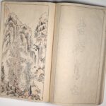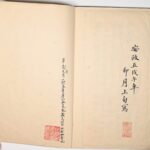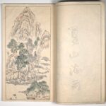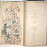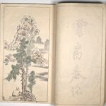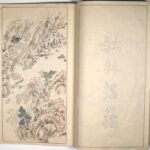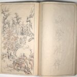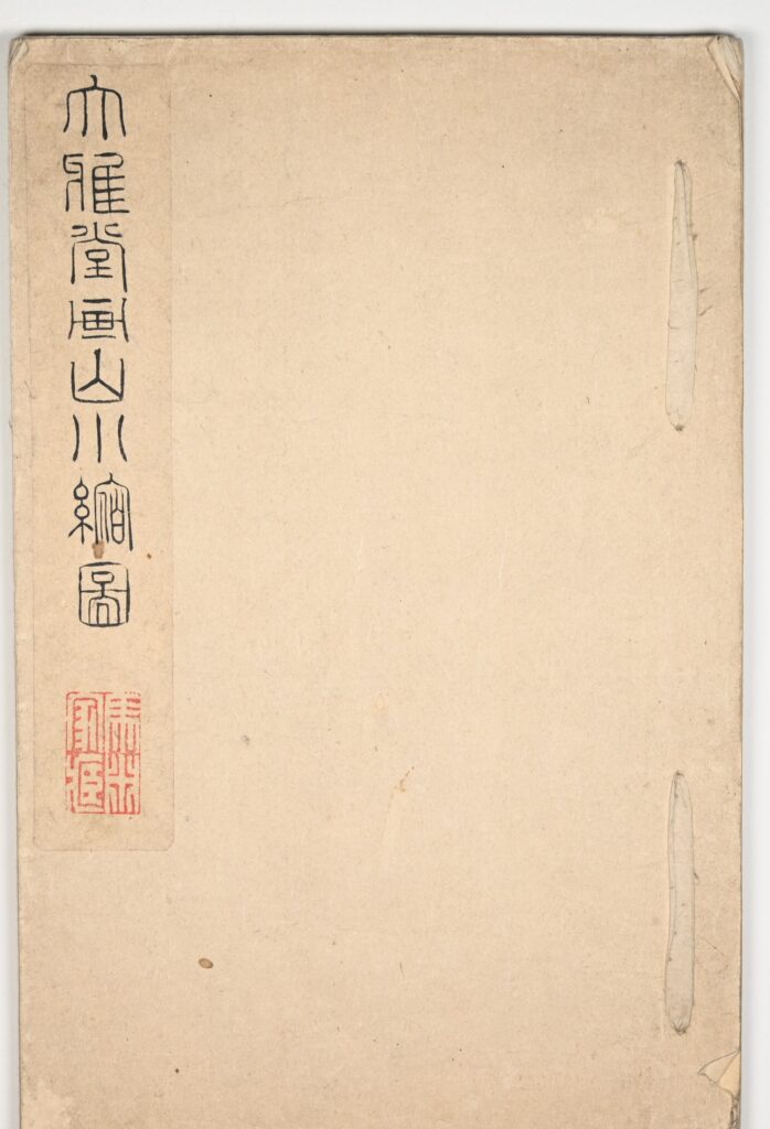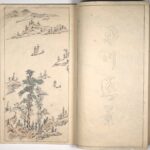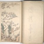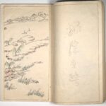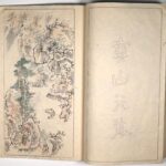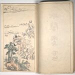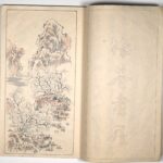 This book reproduces a pair of six-panel screens by the renowned artist Ike no Taiga. On each spread, the left page features a landscape scene, while the right page displays a corresponding four-character title in thin outline. The scenes follow a seasonal sequence from early spring to winter, mirroring the traditional right-to-left progression of a folding screen. A final page features Taiga’s signature and seals, also in outline. The use of outlined characters suggests that the calligraphy was traced directly from the original screens. Despite the much smaller scale, the book captures the essential imagery of the original work.